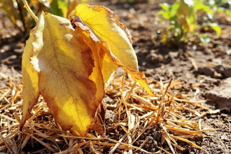 - Feuillage flétri, terne, ou grillé : les tissus verts perdent leur tension habituelle, jaunissent ou présentent des taches brunes.