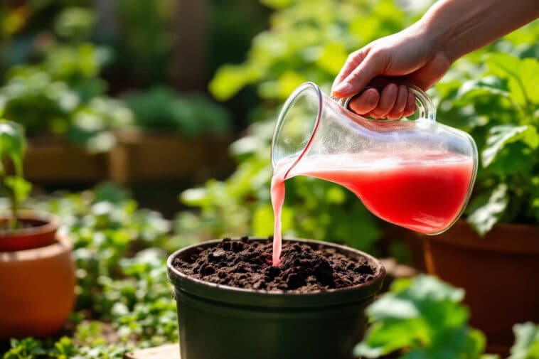 Arroser directement sur la terre, au pied des plantes, de préférence le soir lorsque le soleil baisse, pour que l’humidité soit mieux absorbée. Adapter la quantité : quelques cuillères à soupe suffisent pour un petit pot, l’équivalent d’un verre pour un grand bac ou une jardinière. Dans les massifs en pleine terre, verser autour des pieds (jamais sur les feuilles) et compléter avec un peu d’eau, surtout en période de grosse chaleur. Cette méthode fonctionne aussi très bien pour les plantes aromatiques en pot ou les petits arbustes d’ornement.