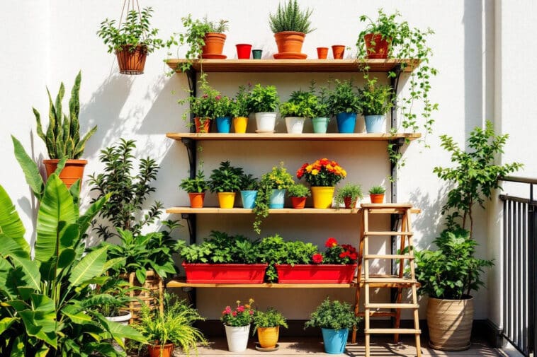 La technique la plus efficace ? Installer des jardinières sur plusieurs niveaux. Pensez aux escaliers à plantes, souvent démontables et très faciles à installer sur un petit balcon. En empilant vos différents contenants, vous structurez naturellement l’espace : les petites aromatiques en haut, les retombantes ou grimpantes en bas, quelques grandes vivaces au centre. Visuellement, le regard grimpe et plonge, donnant la sensation d’un vrai massif de jardin miniature.